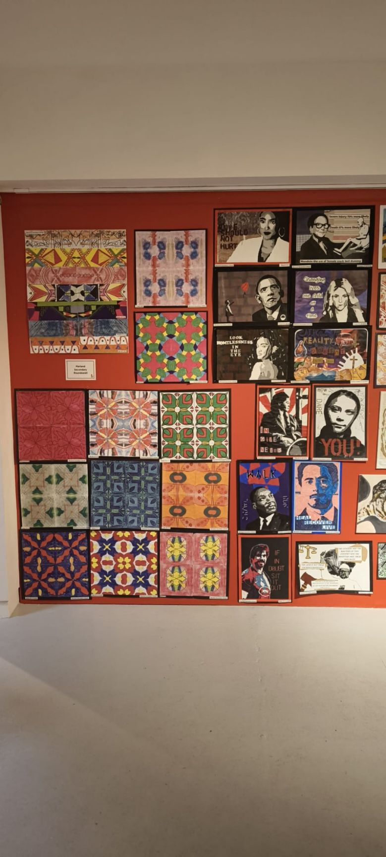 KS3 students spent a half‑term exploring and creating patterns inspired by traditional designs from cultures around the world. Their work focused on developing rotational symmetry and repeating tessellated patterns. Beginning with a set of lines created at either a 45‑ or 90‑degree angle, students rotated their motifs through a full 360 degrees to construct their final design. These were then coloured using a range of media, copied, and repeated to create the enlarged tessellated pattern you see here. Some of the students were able to develop these further into designs for lino cuts and polytile prints.