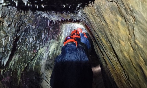 The group were met by a couple of the Mine Society volunteers and were given a bit of background and some safety equipment (helmets and lights). They were then led into the main adit and travelled underground for several hundred metres.